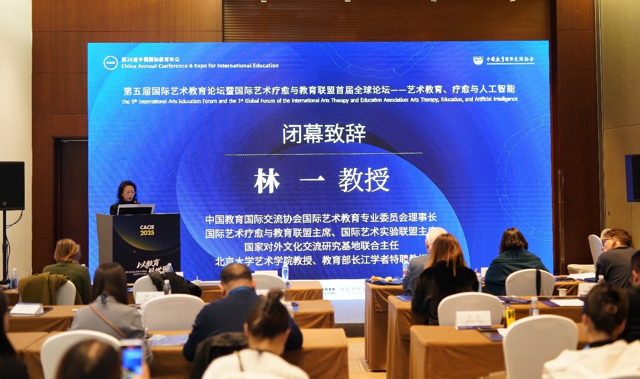 国际艺术教育专委会理事长、国际艺术疗愈与教育联盟主席、国际艺术实验联盟主席、国家对外文化交流研究基地联合主任、教育部长江学者特聘教授、北京大学艺术学院林一教授最后致辞。她强调,艺术教育启迪心智,塑造灵魂,教会我们感知美与表达真我;艺术疗愈抚慰心灵,修复创伤,成为我们通往内在宁静的桥梁;人工智能则成为激发创造力的无限媒介,也是提供个性化支持的敏锐伙伴。专委会将始终秉持自成立以来由她提出的“大艺术教育观”理念,突破艺术教育传统边界,致力于艺术教育、疗愈与人工智能的融合发展。